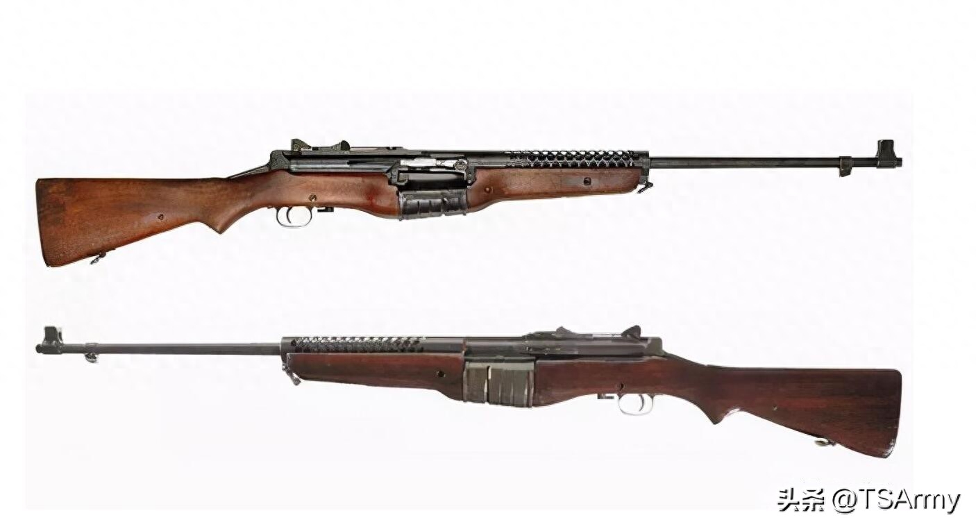 在太平洋战争期间,日军曾对缴获美军的M1加兰德半自动步枪进行研究,在二战末期仿制出了四式半自动步枪,采用与M1相同的原理,在外观上也有些相似,但四式发射7.7x58毫米有坂步枪弹,采用10发固定弹仓供弹,但该枪刚一问世二战就结束了,日军还没来得及装备。