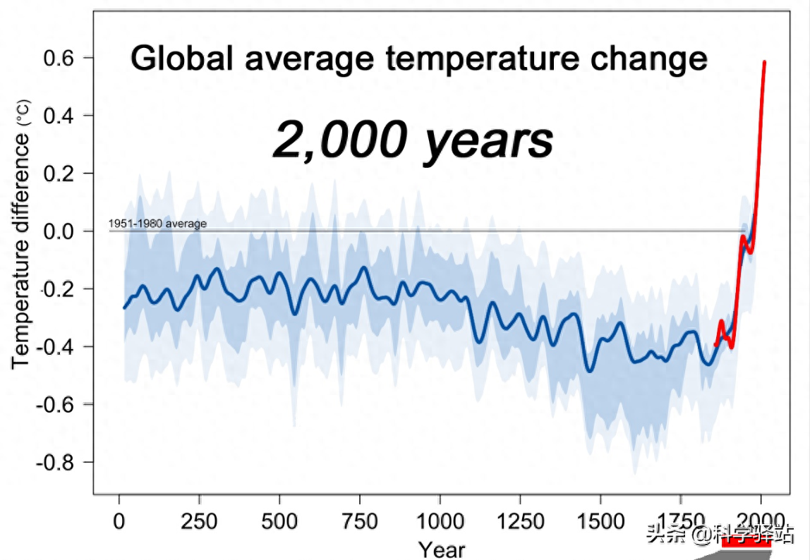 下图所示显示了近2000年的气温变化曲线,可以看出,在1800年之前的气温一直处于下降趋势。