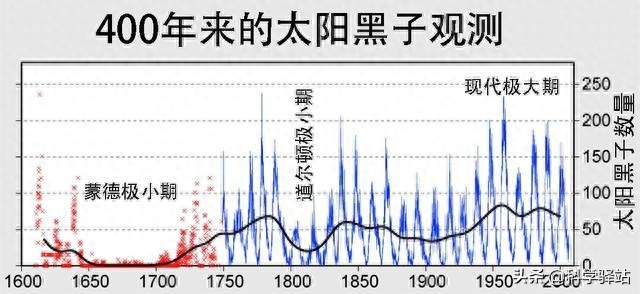而太阳黑子的数量变化是存在周期性规律的,这个周期大概为11年,当太阳黑子数量周期变化时,表现出的就是地球接收到的辐射量的周期变化。在11年的周期以外,太阳黑子的数量还表现出一个大的波动周期,这个周期长达上百年。当黑子的数量处于周期波动的谷底时,太阳活动频率远低于正常水平。