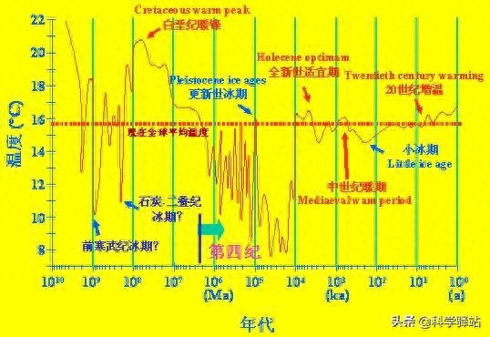 从上图中可以看到,每次冰期的到来都带来了大幅降温,就以距离我们最近的第四纪大冰期为例。当第四纪冰期发生时,当时的地球年平均气温比现在足足低了10℃~15℃,全球1/3以上的大陆被冰雪覆盖,冰川面积达5200万平方千米,冰厚达到了1000多米。第四纪大冰期的气温变化曲线如下图所示: