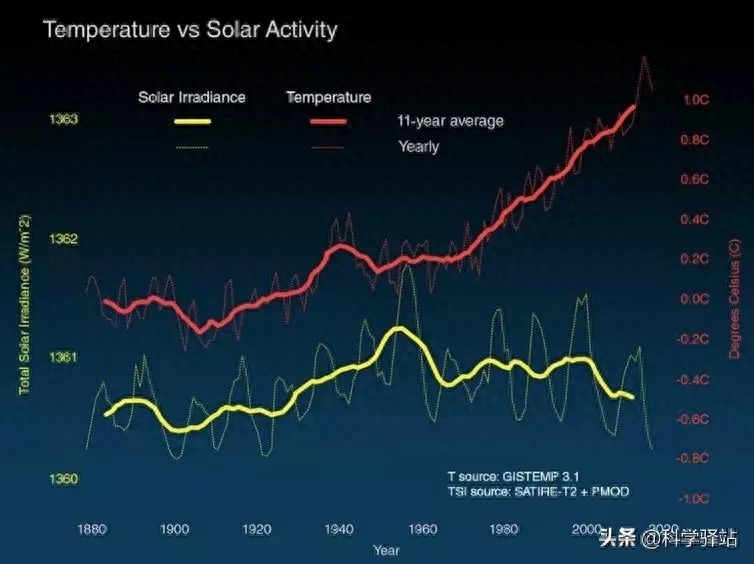 很显然,1880年以来的太阳活动减弱并没有导致气温的降低,人类工业社会以来排放的二氧化碳已经对全球气候的影响占据了主导地位。