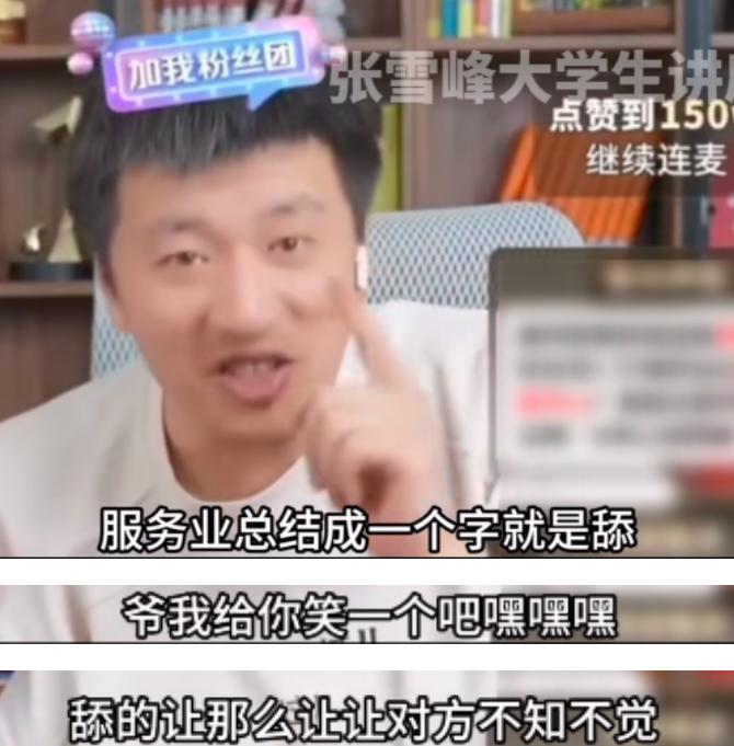 对此张雪峰反问:" 你希望将来上大学院校档次低,还是将来从事低档次的行业。所有的文科专业都是服务业,你知道什么叫服务业吗?总结成一个字就是舔,甲方都是对的,爷我给你笑一个吧,这就叫服务业。"