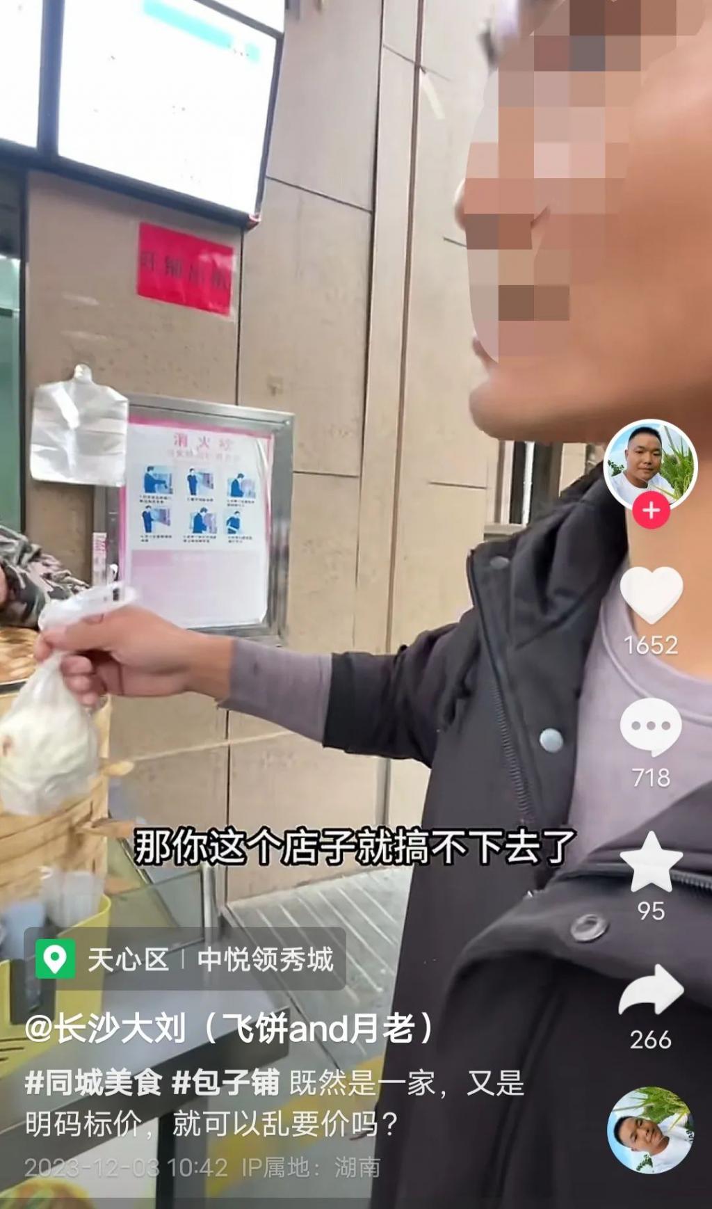 12 月 3 日,有数万粉丝的短视频用户 " 长沙大刘 " 发布视频,情绪激动地询问包子店店主:" 你这个包子是多少钱一个?" 得到鱼香肉丝包的价格为 2 元一个时,男子称 " 我说你小孩子如果要多收 5 毛钱,那你这个店子就搞不下去了。" 随后,他将包子摔在桌上。