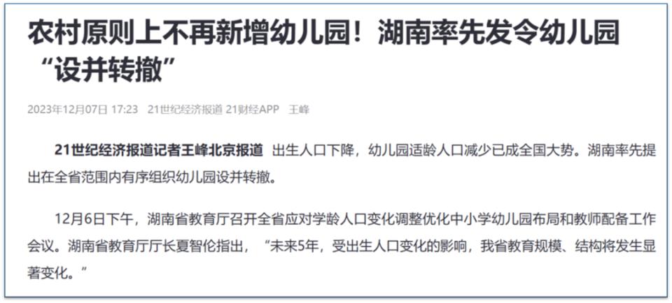 一周多前,湖南省教育厅就已发布通知,有序组织幼儿园设并转撤,在城镇新增人口集中地区新建、改扩建一批公办幼儿园,农村地区原则上不再新增幼儿园。