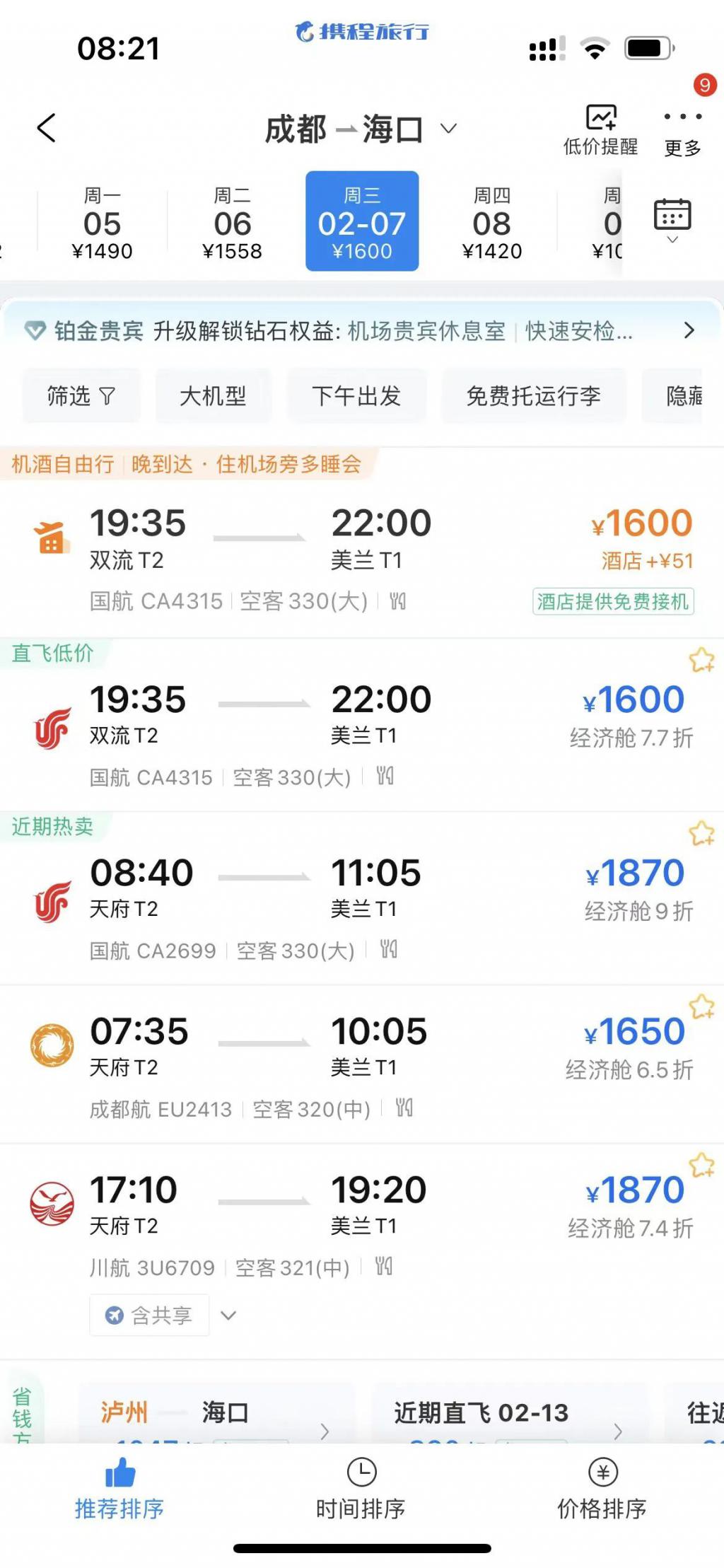 到 2 月 7 日、8 日,也就是腊月廿八、廿九,由于临近春节长假,成都、杭州、衢州、上海飞海口航线经济舱票价普遍逼近 2000 元,甚至更高。