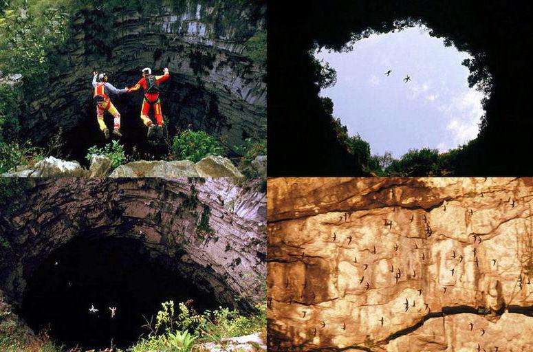 墨西哥燕子洞,地球十大迷人洞穴之一。燕子洞,足以吞噬帝国大厦。这个洞穴外形呈锥状,是上世纪60年代被人们发现的。 燕子洞内栖居着成千上万只蝙蝠和燕子,这也正是“燕子洞”得名的原因。因此,当这名探险者落地后,不得不降落在深达2米的鸟粪山上。