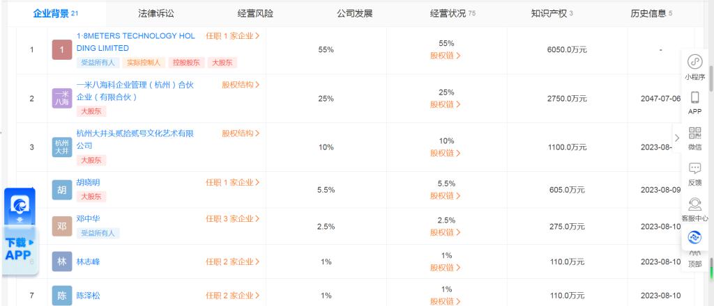 此外,胡晓明、邓中华、陈泽松和林志峰四名自然人还分别持有一米八海洋科技(浙江)1% 至 5% 不等的股权。