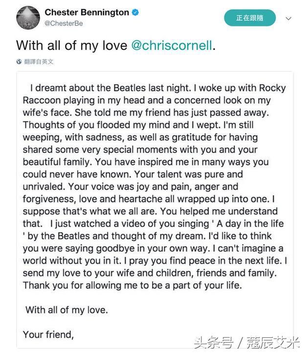 据美媒报导,查斯特-贝宁顿和52岁的Chris Cornell的交情非常好,5月18日挚友在酒店上吊轻生,他曾在推特发文悼念:“你有很多部分激发了我的灵感,我没有办法想像这个世界没有你,祈求你在下一个人生得到安宁⋯⋯。”他曾唱过好友的名曲《Hunger Strike》,对方也回敬一曲林肯公园的《Crawling》,两人在音乐之路惺惺相惜,最后他更在丧礼中献唱圣歌《哈雷路亚》,送好友最后一程。7月20日刚好是好友Chris Cornell五十三岁的冥诞,选择这一天结束自己的生命也许是想随好友而去。