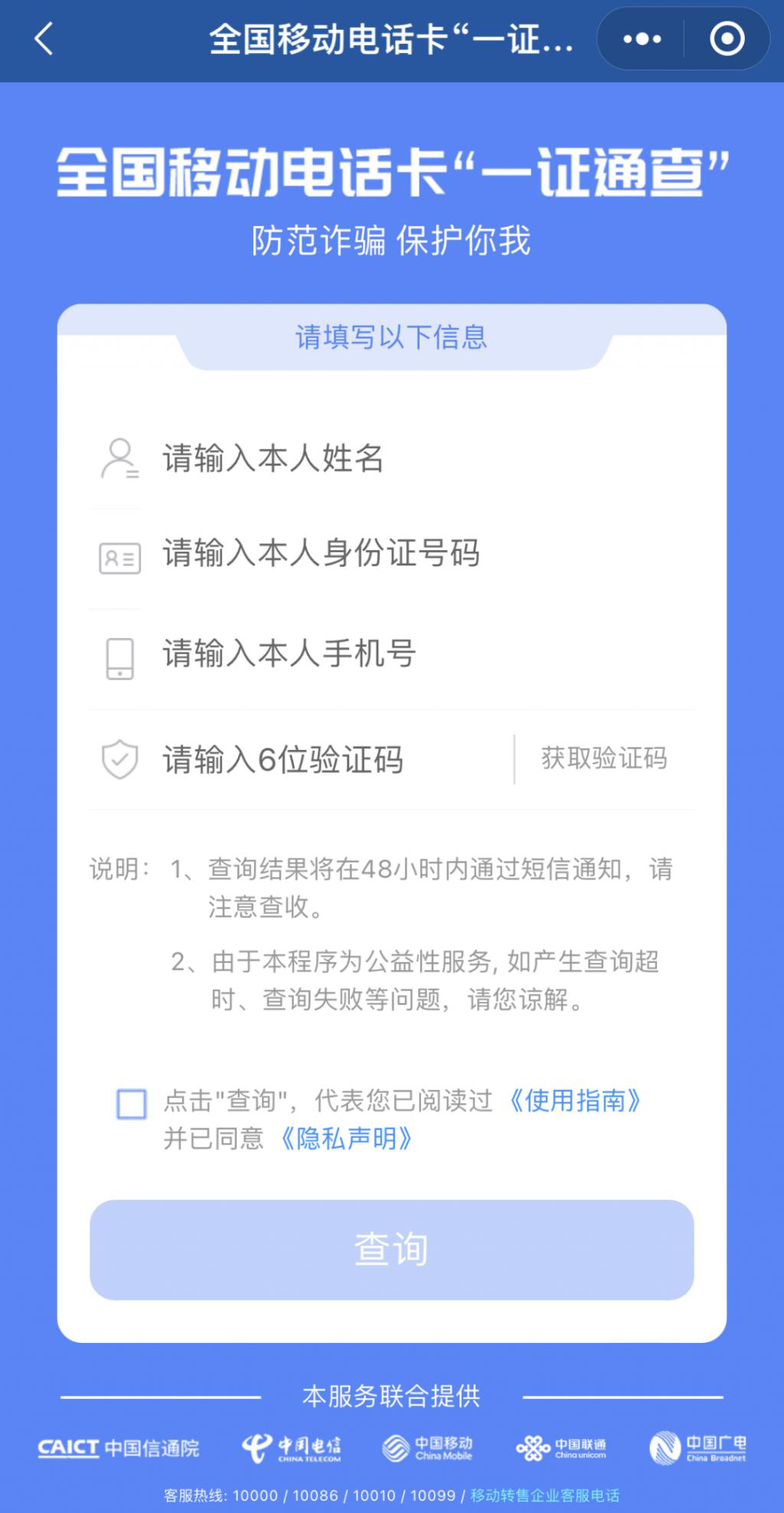 【全国移动电话卡 " 一证通查 "】服务