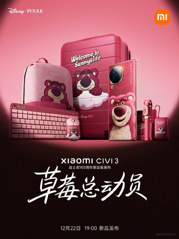 快科技 12 月 21 日消息,12 月 22 日 19:00,小米将带来与迪士尼联名的定制新品——小米 Civi 3 迪士尼草莓熊限定版,并且还有多款周边联名产品。