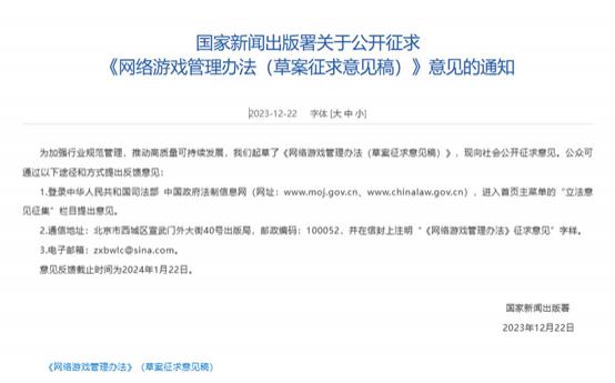 注:国家新闻出版署关于公开征求《网络游戏管理办法(草案征求意见稿)》意见的通知