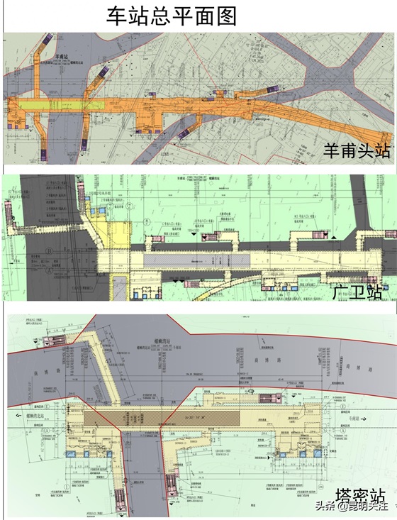 分别为大树营站、菊花村站、菊华站、和甸营站(工程名为昆明东站)、牛街庄站(工程名称为麻苴站)、羊甫头站(涉及部分车站,工程名为云大西路站)、玉缘路站(工程名称为羊甫站)、广卫站(工程名称为螺蛳湾北站)、塔密站(工程名称螺蛳湾站)。