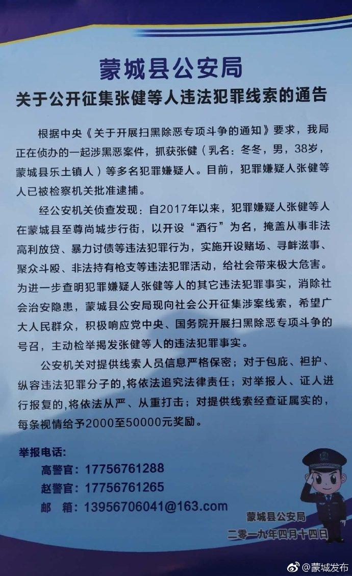 为进一步查明犯罪嫌疑人张健等人的其它违法犯罪事实,消除社会治安隐患,蒙城县公安局现向社会公开征集涉案线索,希望广大人民群众,积极响应党中央、国务院开展扫黑除恶专项斗争的号召,主动检举揭发张健等人的违法犯罪事实。