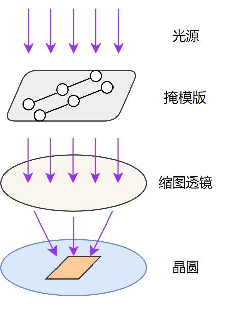 将涂好光刻胶的晶圆放入光刻机中,光刻机的光源发出的深紫外(DUV)或极紫外(EUV)光透过掩模版(也称作光罩),将掩模版上的电路结构图案缩小并聚焦到光刻胶图层上。光刻胶在受光后,受光区域会发生化学变化,掩模版上的电路图形就会被刻到光刻胶图层上,此步骤称为曝光,如下图所示。曝光之后的步骤是烘烤和显影,目的是去除图形未覆盖区域的光刻胶,从而让印制好的电路图案显现出来,永久固定。