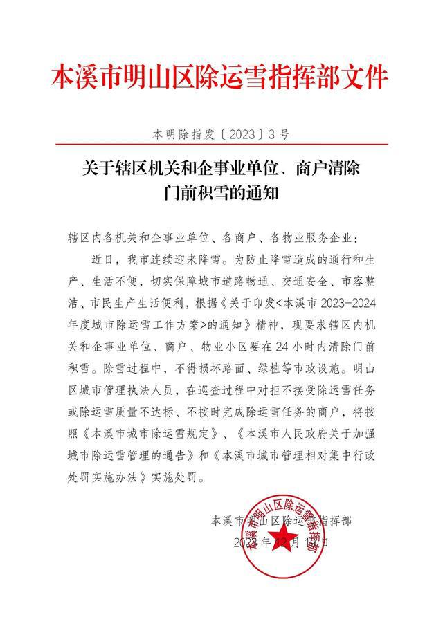 对于通知内容及除雪有关问题,记者联系了明山区住建局及本溪市住建局,均被告知需要由宣传部门进行回复。