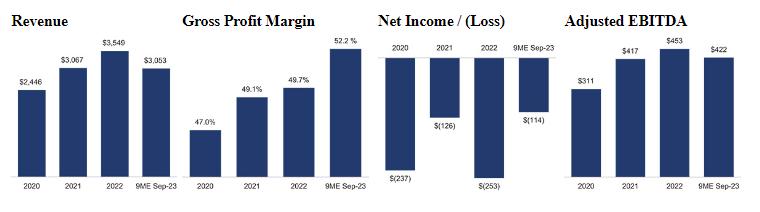 从 2020 年至 2022 年,公司的收入从 24 亿美元增至 35 亿美元,复合年增长率为 20.4%;毛利率从 47.0% 增至 49.7%;净亏损从 2.37 亿美元增至 2.52 亿美元;经调整 EBITDA 从 3.11 亿美元增至 4.53 亿美元,复合年增长率为 20.6%。