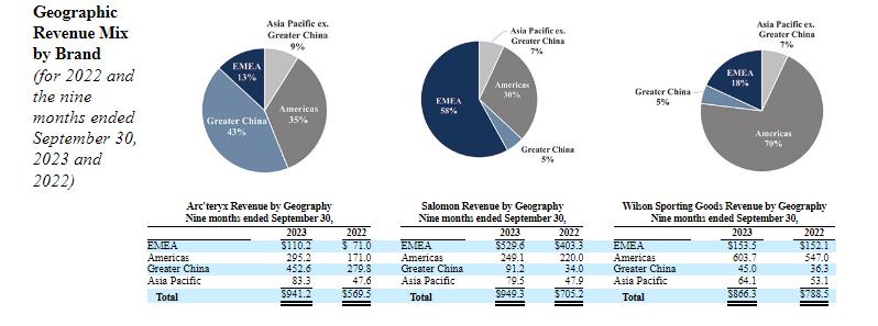 招股书显示,始祖鸟(Arc'teryx)Salomon、Wilson 三大品牌合计营收占比在 2023 年前三季度已超过 90%,其中始祖鸟、Salomon、Wilson 的营收占比分别为 30.8%、31.1%、28.4%。