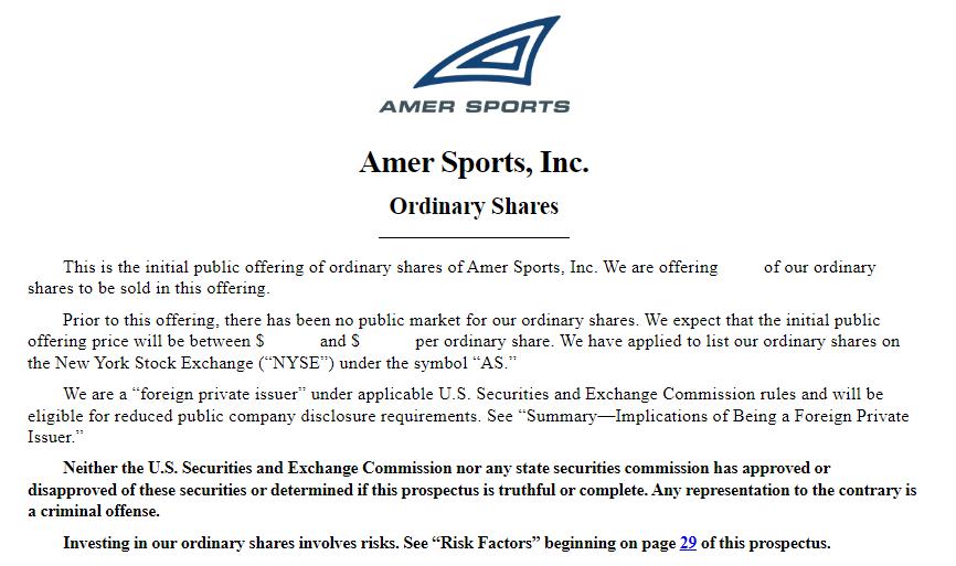 1 月 5 日,安踏体育(02020.HK;82020.HK)于港交所发布公告称,其合营公司 Amer Sports Holdings(cayman)Limited 下属非全资附属公司 Amer Sports 已向美国证监会(SEC)递交招股书,拟于纽约证券交易所挂牌上市,股票代码为 AS。