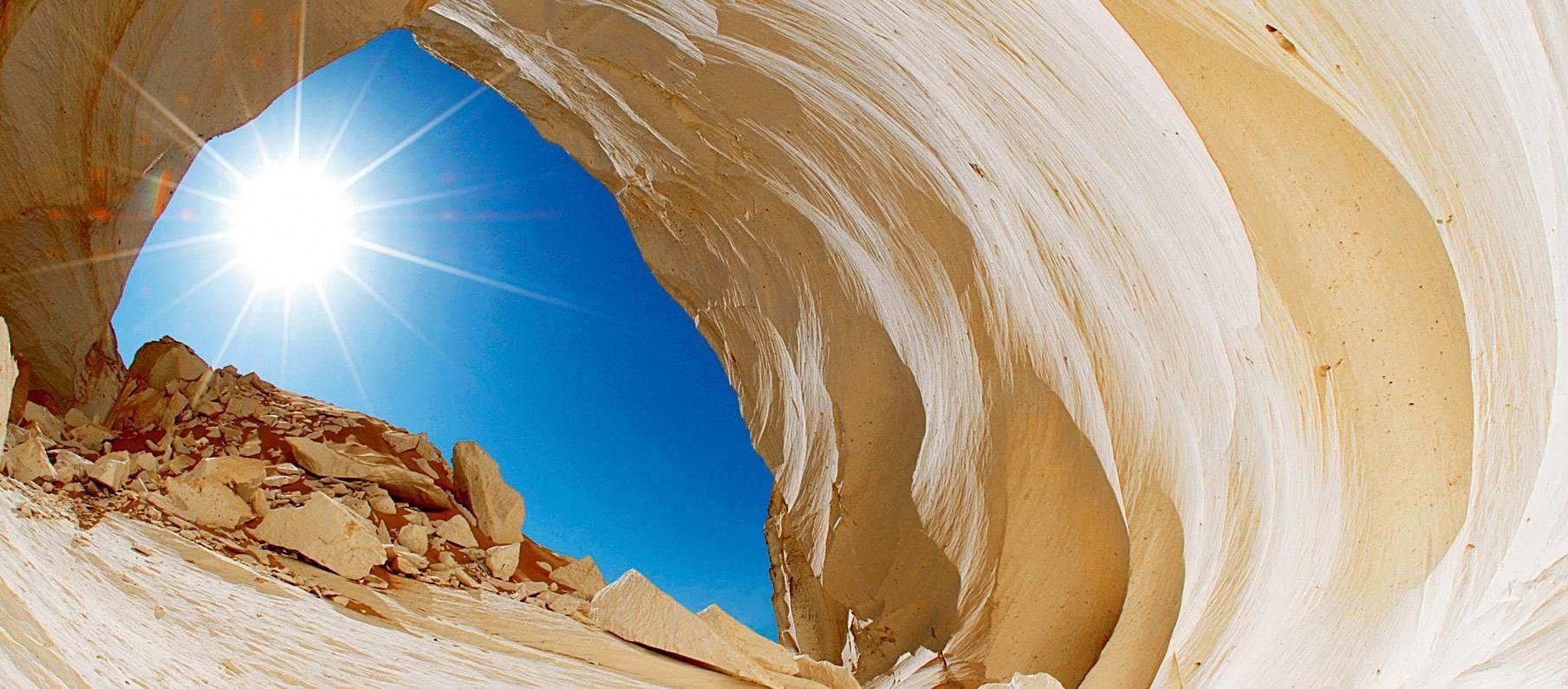 白沙漠的这个名字其实是来自于白垩,这些白垩在沙漠中巍峨屹立着,它其实由数千年沙暴“雕刻”而形成而产生的样子,比如蘑菇、山峰等。在经过风吹后而造成的细石散布,为单调的黄沙漠,添上亮丽的一笔,不禁让人赞叹大自然的神奇。白色沙漠就像是被白雪覆盖了一样,分不清究竟是雪还是沙子。