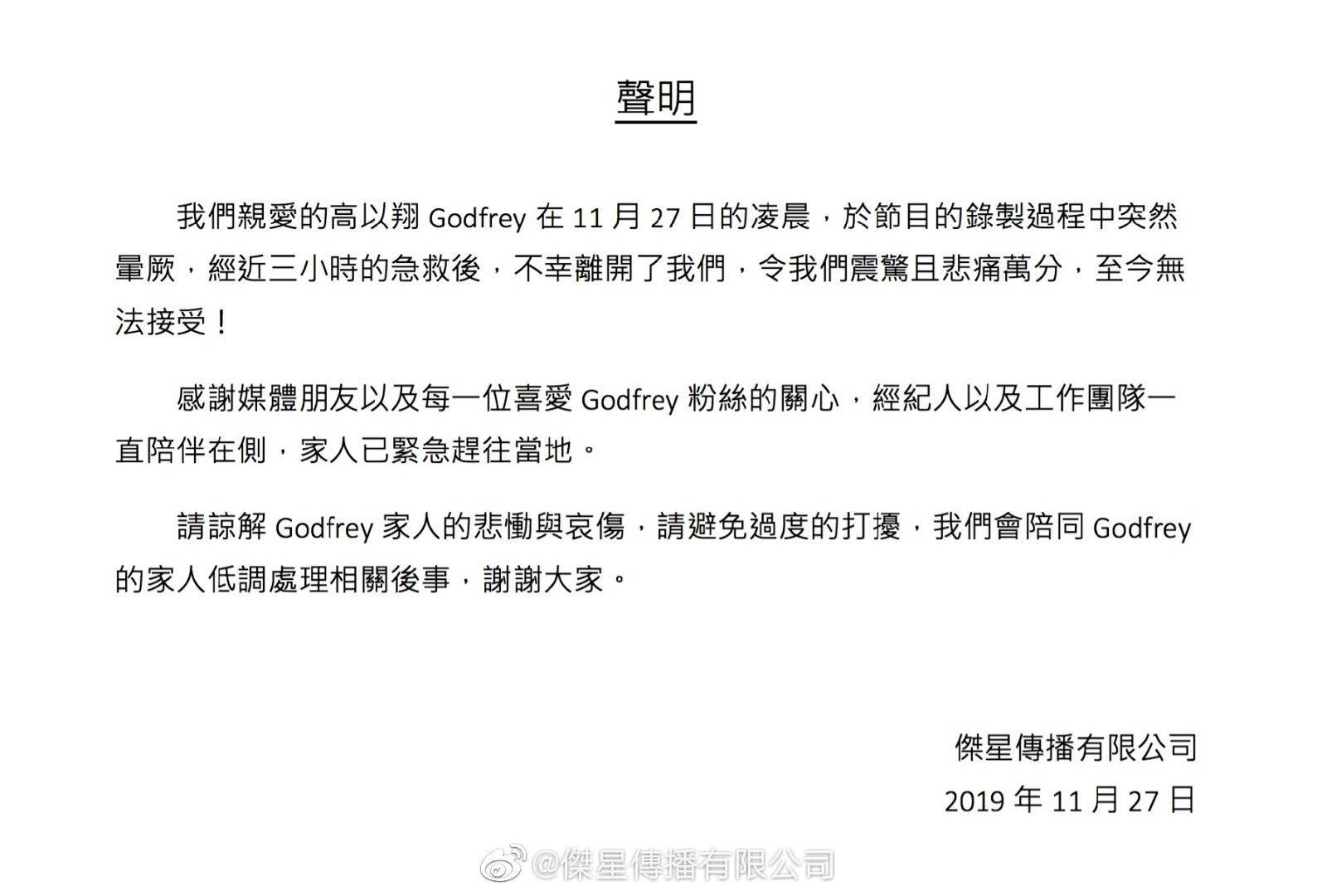 2019年11月27日,演员高以翔在节目录制过程中晕倒抢救,后浙江新闻发文,证实高以翔抢救无效去世。