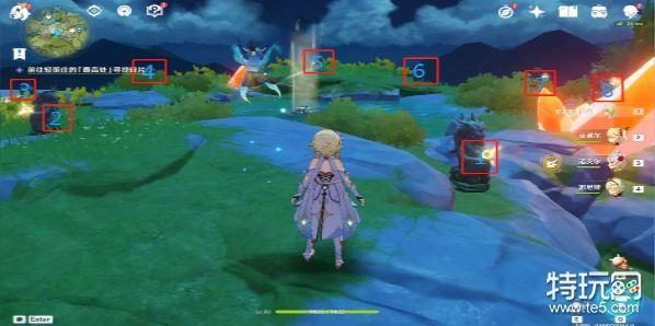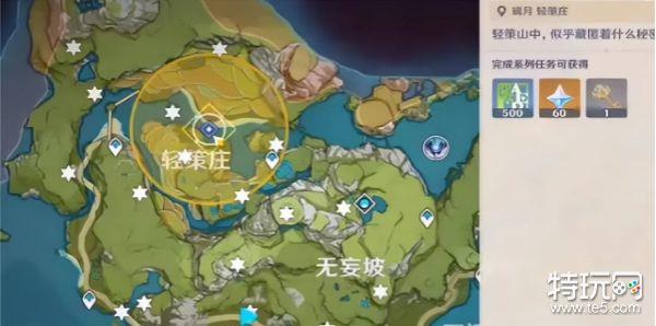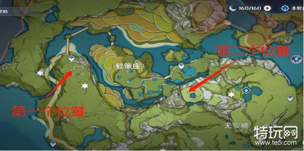 第一个位置在轻策庄左边传送点上面,找到光柱圆盘,旁边有5个岩尊像。与中间光柱圆盘对话来获取提示,按照提示的顺序开启想对应的岩尊像,是很容易的,可以根据地图的方向进行判断。答案有点像五角星形状。