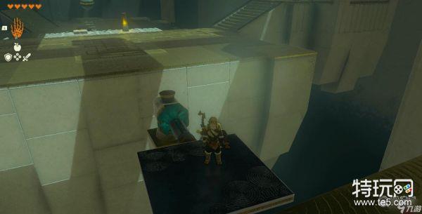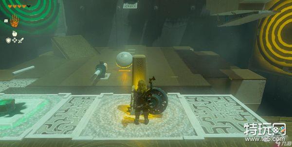 等石球移动至第一个灰色地砖的位置后敲打开关,让石球命中右侧的靶子。