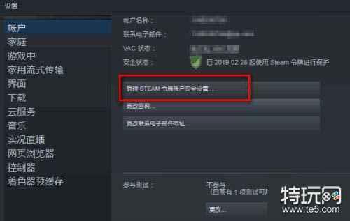 2、进入设置页面后,点击右边的“管理steam令牌账户安全设置”;