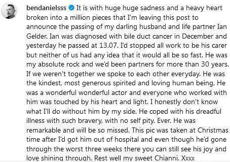 班 · 丹尼尔斯在 5 月 7 日深夜的一则情感充沛的 Instagram 帖子中,以深情而沉重的笔触,公开了这一令人心碎的消息。他在文中透露,伊恩在去年 12 月被确诊患有胆管癌,尽管在这艰难的数月中,伊恩展现了难以置信的勇气与坚韧,积极面对病魔,但最终未能战胜病痛。班 · 丹尼尔斯还分享了一张两人亲密的合照,照片中洋溢着两人多年来的深厚情感,他坦诚地表示,两人相伴长达 30 载,每日的交流对话已经成为生活中不可或缺的一部分,伊恩的离去对他而言无异于失去了生命中最为重要的一半,言语间流露出无尽的悲伤与不舍。