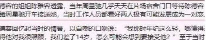 之前在采访的时候,陈德容曾表示当时周星驰总是开着车带她出去玩,但她并没有掺杂感情,还表示周星驰这个人平时很闷,认为两个人相差14岁,无法走到一起。