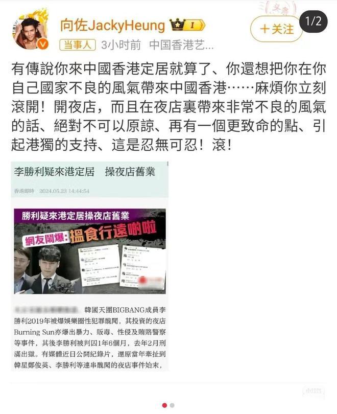 据悉,李胜利被曝去香港发展,向佐喊话让李胜利离香港远一点,他甚至查了李胜利所有外网账号,不过全部被封了,还问网友谁有他电话。