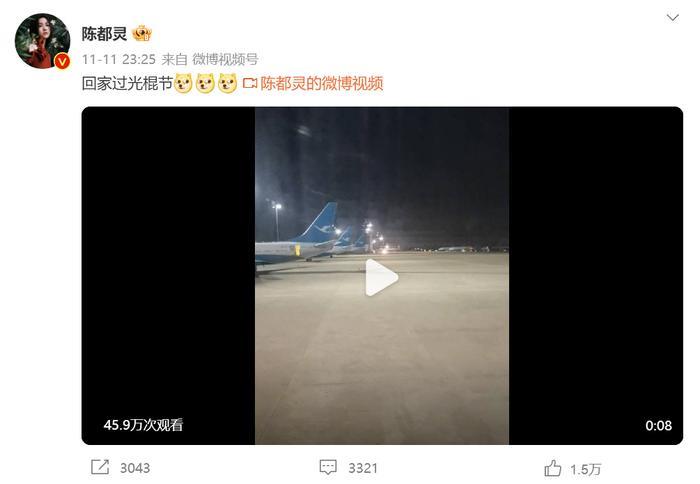 而在11月11日晚,陈都灵晒出一小段在机场的视频,并配文称:回家过光棍节。陈都灵说自己过光棍节,很明显就是在说自己单身的意思,不知道是不是在回应此前的传闻。