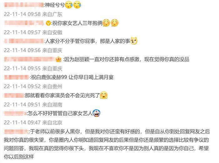 11月14日,虽然汪汐潮什么都没有说,但是于正跑到人家11日发的视频下面留言:情场失意,事业就会好,加油啊!见光死的爱情不牢靠,不要也罢!