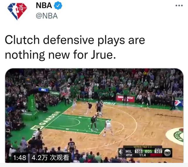 NBA官推赛后晒出霍乐迪的关键时刻精彩视频,并且配文写道,“霍乐迪关键时刻,总能防住对手,这真的不是什么新鲜事。”