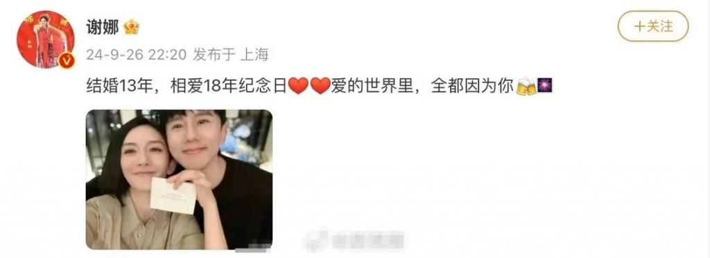 9 月 26 日,张杰晒和谢娜合照,并配文:" 纪念我俩结婚十三年。让爱,继续蔓延。" 庆祝结婚 13 周年纪念日。