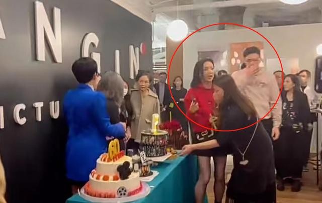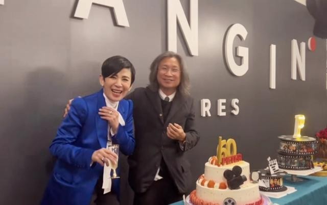 陈可辛跟员工以及好友们一起庆祝生日,在唱生日歌的时候,他突然向一旁的人招手,原来他在叫吴君如。