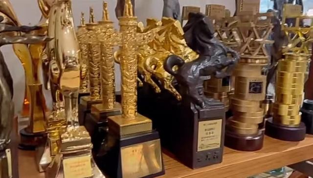 只见陈可辛历年来在各大电影节上赢得的奖项,摆满了一桌子,阵仗相当大,过道上则放置着刘德华等好友送给他的鲜花。