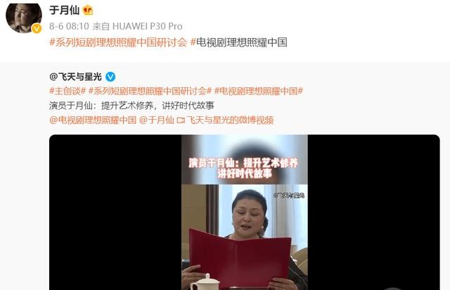 而最后一条微博,是转发电视剧相关,视频中她谈到电视剧艺术,表示要提高艺术修养,讲好时代故事。于月仙对影视作品的热爱,可以非常令人敬佩。