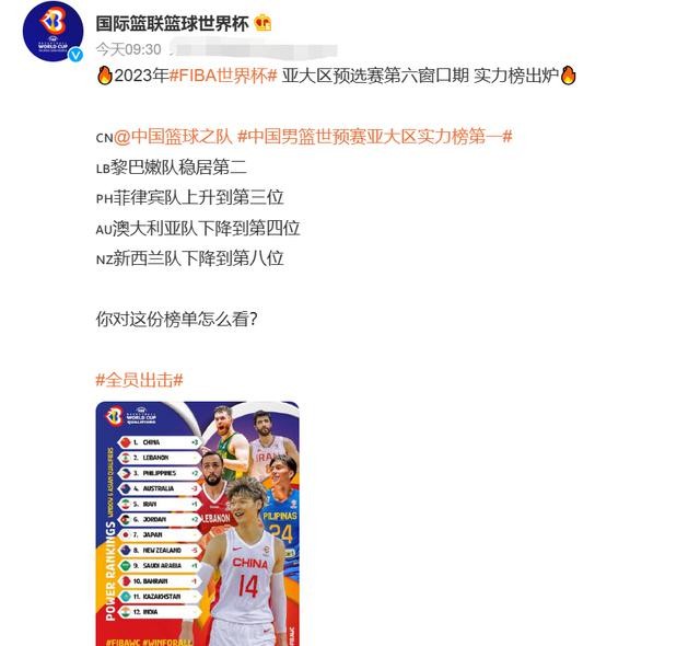 2025 男篮世界杯亚洲区预选赛第六窗口期的赛程已经公布,FIBA 也更新了世预赛亚太区实力榜,中国男篮名列榜首,在网上引起热议。