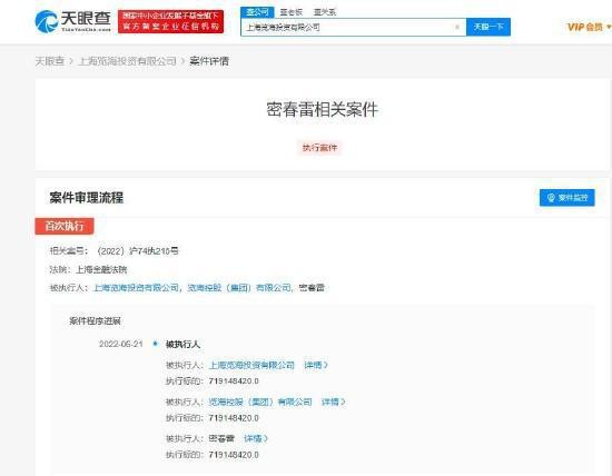 网易娱乐 7 月 4 日报道 据天眼查 App 显示,近日,上海览海投资有限公司、密春雷、览海控股(集团)有限公司新增被执行案件,执行标的约 7.19 亿元,执行法院为上海市金融法院。