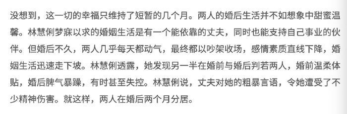 林慧俐对于分居这件事憋了大半年终于忍不住对外坦诚了这个事实。说起来,林慧俐与这一任丈夫也算是闪婚闪离了,两人相识的时间很短暂,是通过共同认识的朋友所认识,男方今年33岁,从事IT行业,身份神秘,而身家肯定不如林慧俐——林慧俐的父亲林荣福是新加坡十大富商之一。两人在2025年底相识,2025年10月就宣布要结婚,因为疫情而把婚礼延期到了2025年2月22日。虽然是下嫁对方,但是林慧俐豪花了百万,把自己嫁得风风光光,出嫁当天穿戴了巨型项链与7对巨型龙凤镯,还戴了金色的皇冠,坐上了限量版的劳斯莱斯出嫁,抢占了当地媒体的版面。