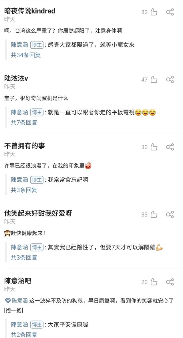 最后陈意涵说自己很会选老公,自己已经好久没看电视了,要追完6季自己喜欢的作品,而且自己4天就从阳性转成了阴性,不过自己还要隔离七天后再下楼。