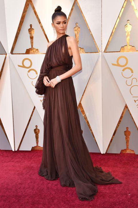 Zendaya在2018年的奥斯卡上挑战这套介于棕色与酒红色之间的Giambattista Valli斜肩礼服,搭配上简约华丽的珠宝,展现大器华美的风格。