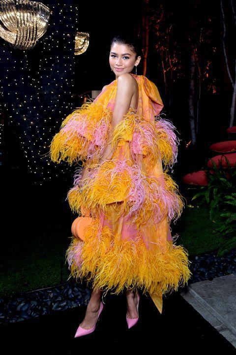 一套Marc Jacobs的粉黄配色羽毛洋装搭配粉嫩跟鞋,Zendaya用极度戏剧化的蓬松轮廓衬托纤长四肢,成功驾驭彩球般夸张甜美的礼服。