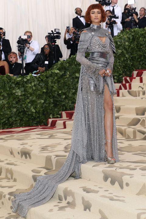 在以宗教为主题的2018 Met Gala上,Zendaya戴上红色假发,身穿Versace的银灰色盔甲礼服,以摩登风格重新诠释圣女贞德的形象。
