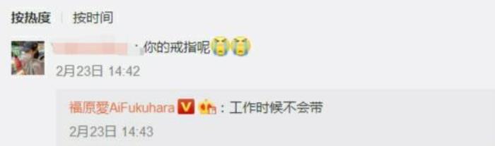 2月23日,福原爱回日工作,被发现没有戴婚戒,有网友问她婚戒的问题,她回复说工作的时候不戴。