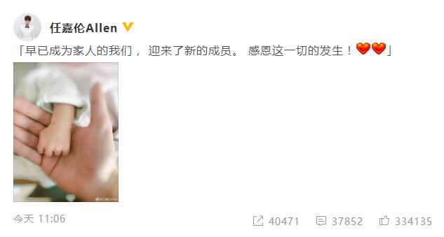 娱乐圈又添了一桩大喜事,人气小生任嘉伦2月2日更新微博,称“早已成为家人的我们,迎来了新的成员。感恩这一切的发生!”,晒出一张儿子的小手照片,宣布自己当爹,与女友聂欢也已经组建家庭。