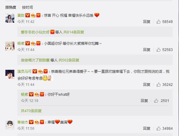 在任嘉伦公布喜讯之后,娱乐圈一众好友纷纷送上祝福,曾经搭档出演《大唐荣耀》的景甜第一个送上祝福:惊喜、开心、祝福、幸福快乐永远哦!随后杨紫、秦俊杰、马可等也送来祝福!