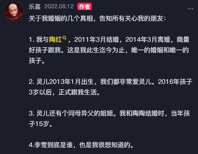 如果乐嘉所言是真的,那为什么资料表中“明星关系”一栏,写着他的前妻叫“李雪”,而不是陶红?难不成是有人将陶红误认成了李雪?这也不应该吧。