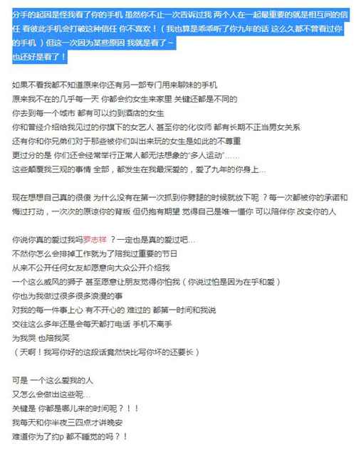 周扬青的分手公开信写了很长,我们从中发现罗志祥其实早有前科,只不过每次都给周扬青道歉,花言巧语的道歉,每次周扬青都原谅了,后来周扬青不小心翻看手机后,发现罗志祥根本没有改正,从来一直都是这么渣。