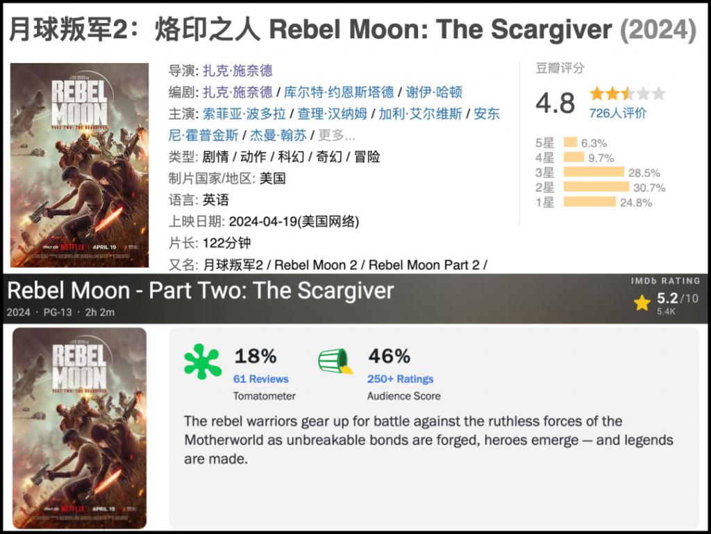 豆瓣 4.8,烂番茄新鲜度 18%、爆米花指数 46%,IMDb5.2… 评分继续狂跌,勇刷个人新低。